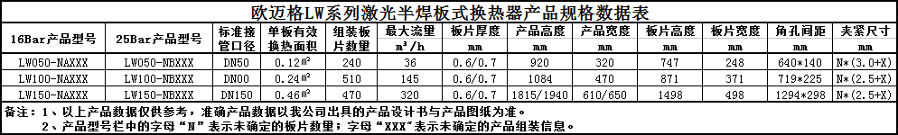 歐邁格LW系列激光半焊板式換熱器產品規格數據表